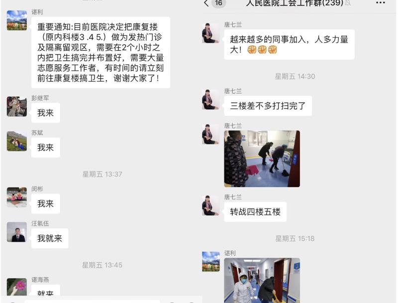 随着疫情发展,考虑到原发热门诊留观病床有限,大年三十13点20分,当谌勇院长审时度势、未雨绸缪,果断决定腾出康复楼作为新型冠状病毒感染的肺炎救治专用场所的消息发至群内时,立马就集结了60余名志愿者。短短两个小时的时间,康复楼内的所有病人全部顺利转入医疗综合大楼,五层楼的房间不仅打扫得焕然一新,井然有序,而且严格按照隔离病房的要求布置到位。一楼为DR检查室,二楼和六楼为工作人员生活区,三楼为普通发热病人就诊留观区,四楼为特殊发热病人就诊留观区,五楼为特殊发热病人救治区。住院病房冷热水供应到位,所有用于工作人员和患者的餐饮、生活用品均由医院统一配送。