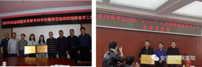 2019年荣获益阳医学高等专科学校“临床办学综合考评优秀教学医院”、“学生党建工作管理优秀教学医院”。在2020年益阳医专教学考评中我院荣获“2020年度“1+1+1”人才培养教学管理优秀团队奖”。在2020年在全国临床医学职业教育诊断学联考中,我院临床5.6班以平均分96.2的好成绩荣获全国排名第一名,其中100分的有33名学生,及格率100%。