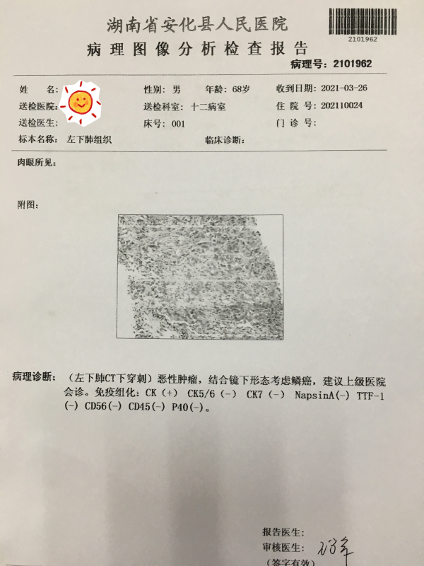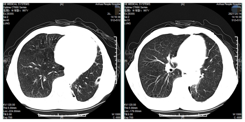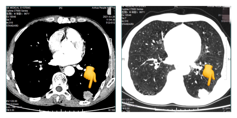 患者吴**,男, 67岁。因“发现左下肺结节15天”于 2021年04月01日入院。我院3月26日胸部CT平扫三维成像加增强:1.左肺下叶后基底段占位性病变,考虑周围型肺癌可能性大。我院3月26日肺穿刺取组织送检病理结果示:恶性肿瘤。