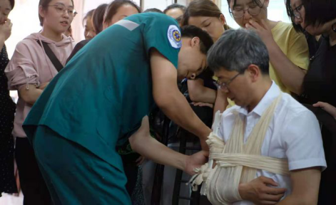 急诊科护士长、导师刘灿星,急诊科副主任医师、导师郭笑天分别就徒手心肺复苏步骤、体外自动除颤仪(AED)的使用及气道异物梗阻急救基本理论,创伤四项技术(止血、包扎、固定、搬运)等理论课程进行细致讲解。完成理论授课后,培训导师谌艳玲、熊妹稀、刘寿长等针对心肺复苏、AED以及常见的止血包扎等技术进行了现场培训。全天8小时的课时,可谓是干货满满。老师教得仔细、学员学得认真!
