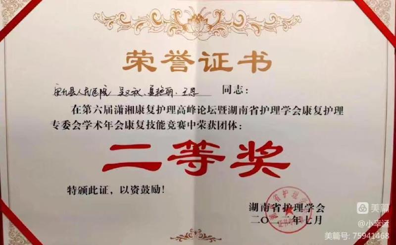 本次会议以"传承·示范·创新"为主题,大会分为:国内知名专家课题讲座、护理查房竞赛、康复护理技能竞赛三大部分。在强手如云的激烈角逐中,安化县人民医院参赛选手,凭借扎实的理论基础、熟练规范过硬的操作技能,在27支队伍入围的康复护理技能竞赛中,荣获团体二等奖,以及个人单项操作二等奖!