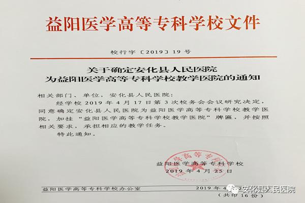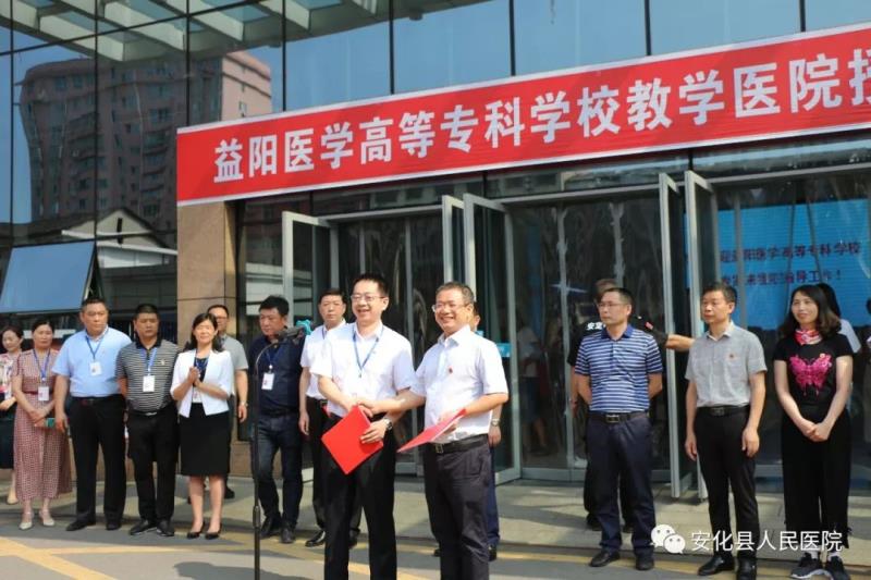 授牌仪式在我院举行,学校校长刘柏炎亲自带队,益阳医学高等专科学校教务处处长付学红正式宣读了《关于确定安化县人民医院为益阳医学高等专科学校教学医院的通知》,签订了益阳医学高等专科学校与安化县人民医院建立教学医院合作协议书。