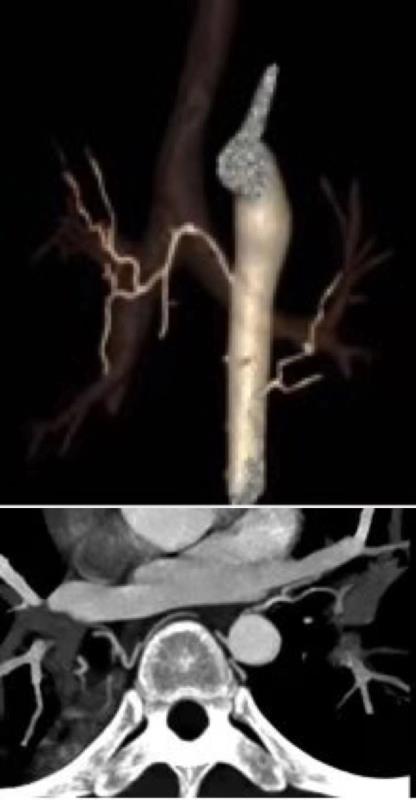 研究认为,支气管动脉作为肺部介入手术的主要靶血管,在实施介入手术前,对有肺部基础疾病的患者行支气管动脉CTA检查,支气管动脉能都得到阳性显示,同时能提供一个非侵入性评价支气管动脉及其肺部病变的有效方法。