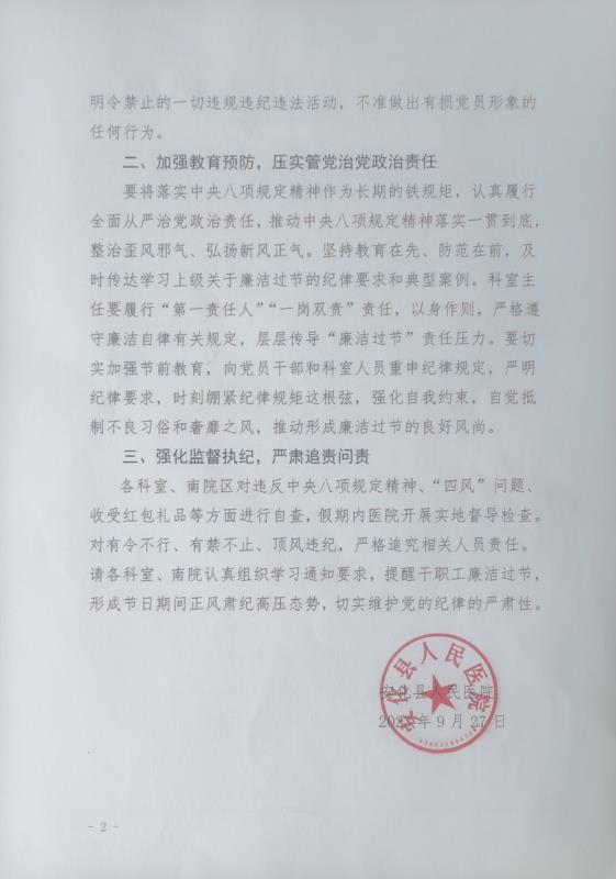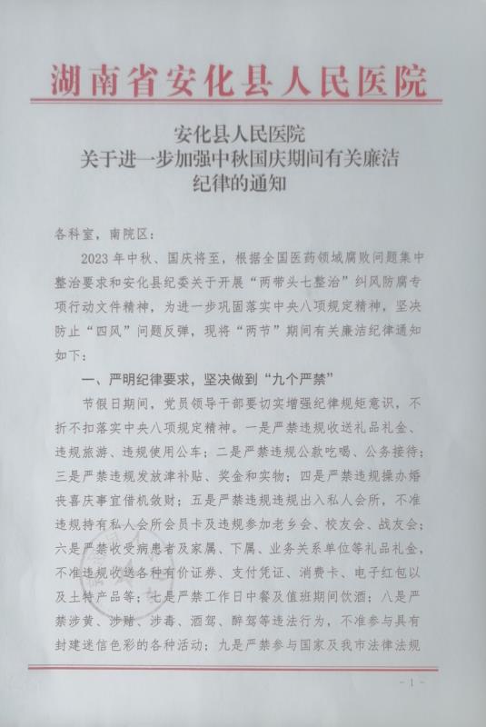 安化县人民医院关于进一步加强 中秋国庆期间有关廉洁纪律的通知