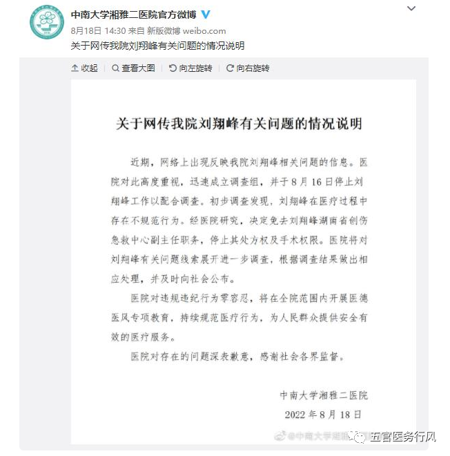 8月18 日,中南大学湘雅二医院发布“关于网传我院刘翔峰有关问题的情况说明”。